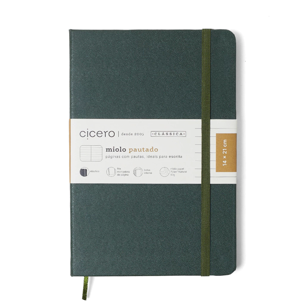 Caderneta Cícero Clássica Pautada 14x21 Verde Oliva – sua aliada perfeita para organizar pensamentos, anotações e sonhos. Com capa dura e cantos arredondados, é resistente e elegante, enquanto o elástico em cor contrastante adiciona um toque especial e mantém tudo no lugar. A fita de cetim marca suas páginas mais importantes, e a bolsa interna guarda cartões e pequenos detalhes do seu dia. Suas 160 páginas em Papel Pólen Natural 80g/m² garantem uma escrita fluida e confortável. Ideal para o trabalho, os estudos ou para registrar inspirações. E para tornar essa experiência ainda mais única, você pode personalizar a capa com o seu nome. Porque organização também tem personalidade!