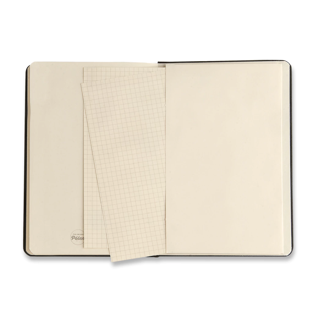 Material interno: Papel Pólen®Natural 80 g/m2; Fita em cetim para marcar páginas; Bolsa interna para guardar cartões