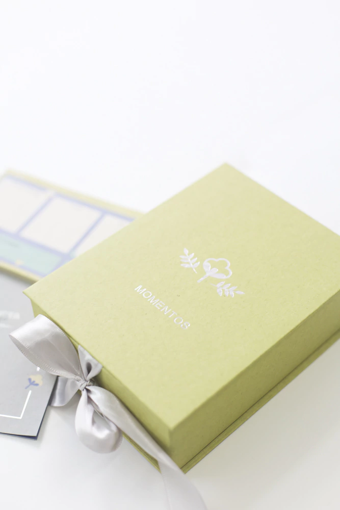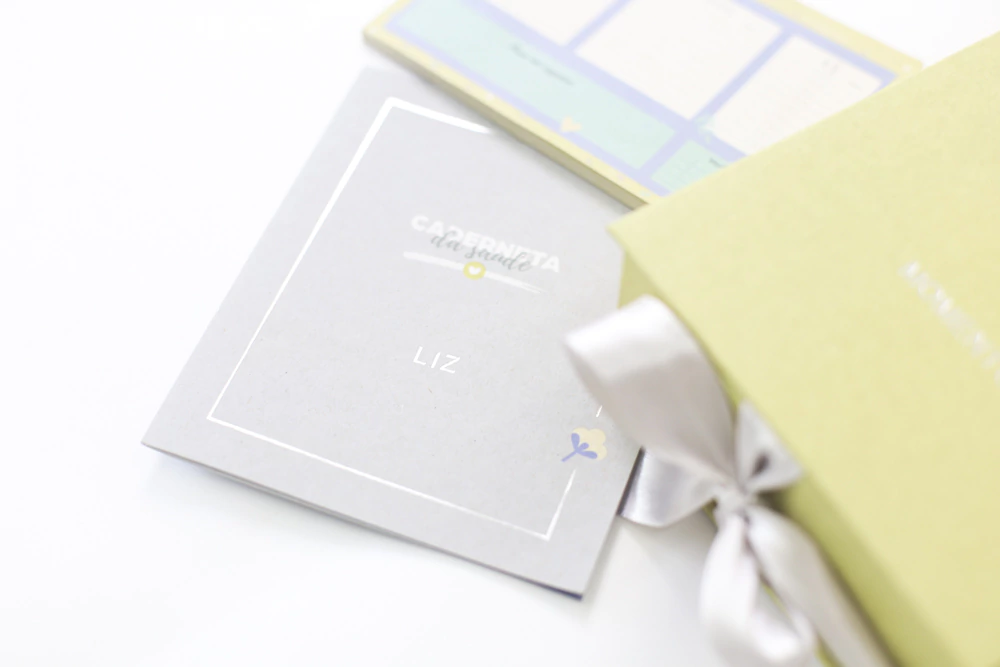 A possibilidade de personalização da capa da caderneta da saúde e lateral da caixinha para fotos impressas com o nome do bebê, é como adicionar um toque especial de magia e significado pessoal.