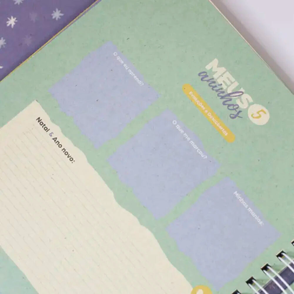 Cor: capas na opção Verdinho Querido, Cinza Moderninho e Lilás Fofo. Cores internas e design fofo, moderninho e unissex.