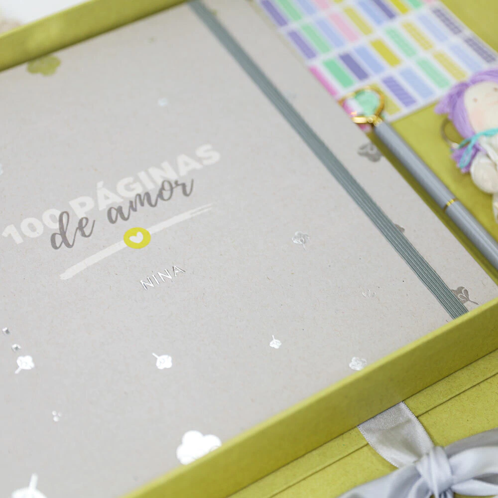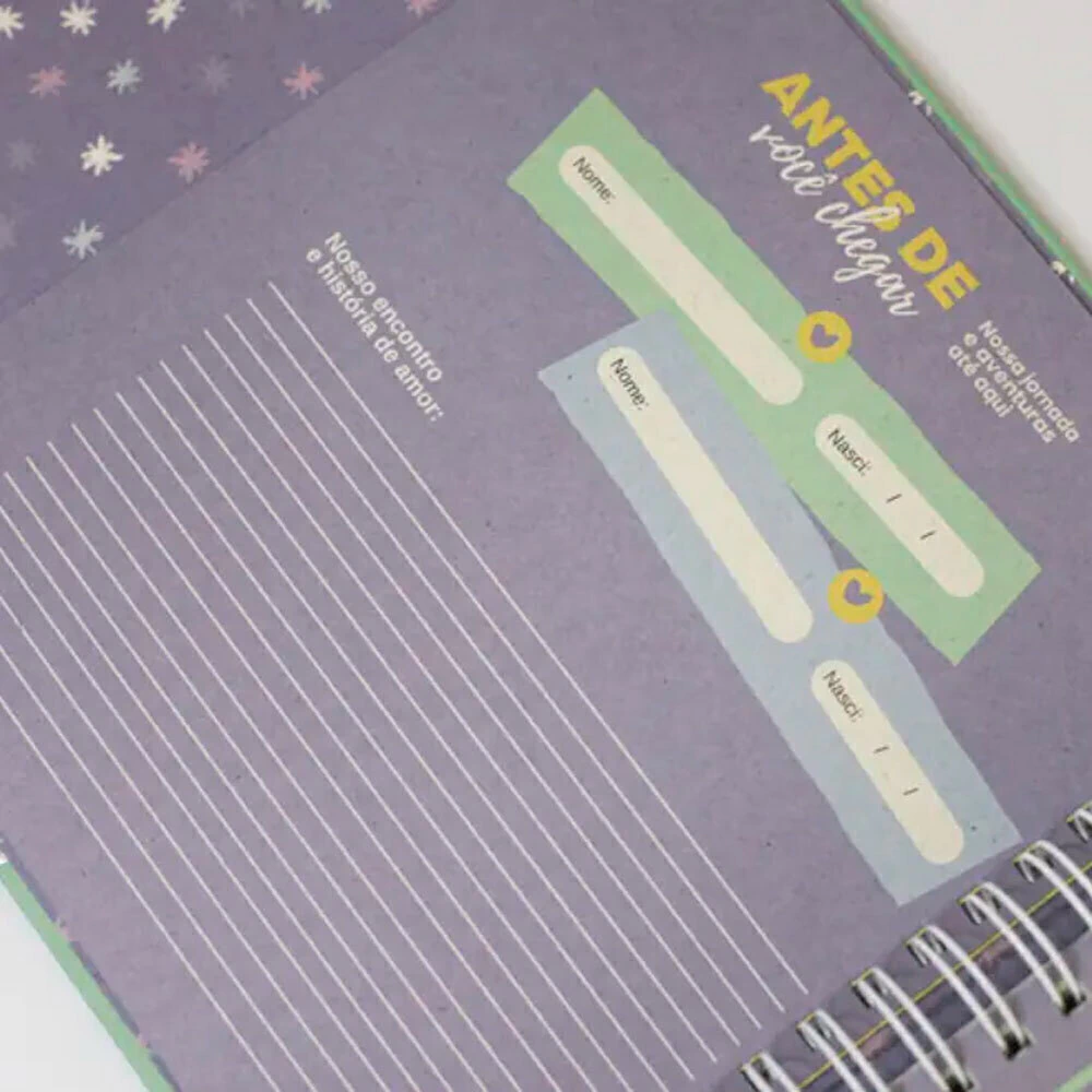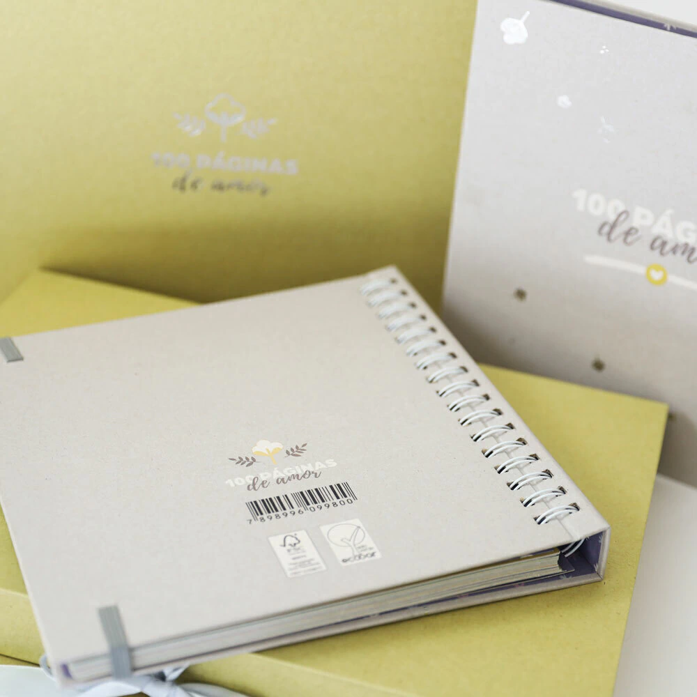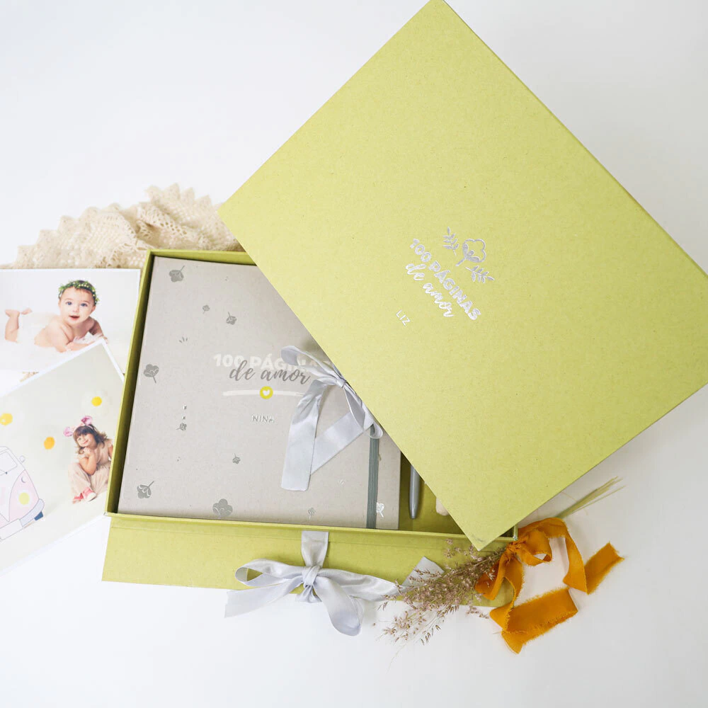 O kit vem em uma Caixa Organizadora elegante, perfeita para guardar o livro, fotos, cartas e outros itens especiais, simbolizando o amor e cuidado dedicado a cada momento. Tudo isso é feito com papel reciclado e certificado, reforçando o compromisso com um mundo mais sustentável.